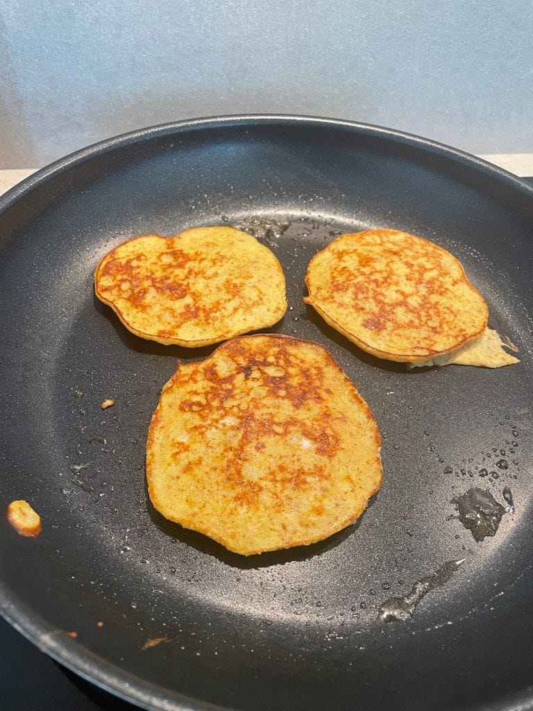 Scoop into small circles onto a greased pan on medium heat, flipping when golden brown (about 2 minutes).